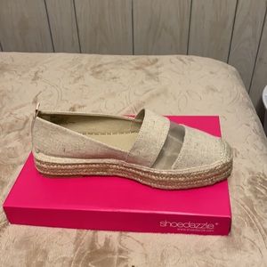 Tan/sand platform espadrille with mesh insert across top of foot