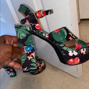 Beautiful green, red, black , white platform(palm tree and flowers pattern) heels worn 2hrs