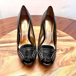 Stilletto Heel with penny loafer detail upper. Black patent leather with white detail stitching. Like new.