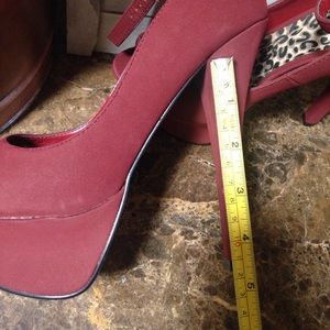 Burgundy color, not really red. Never been worn. Bought because I think they're cute and oriental looking. But they were too high for me.
