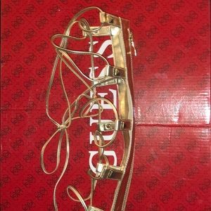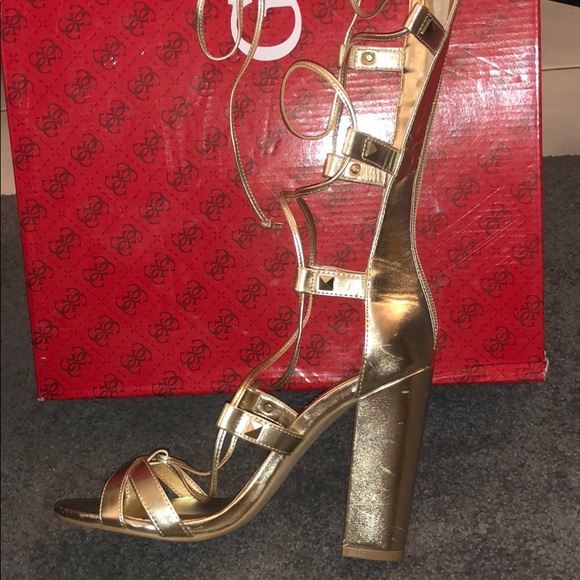 Gold under the knee tie up platform heels from Guess, has a spaghetti string tie in the front and a zipper in the back.