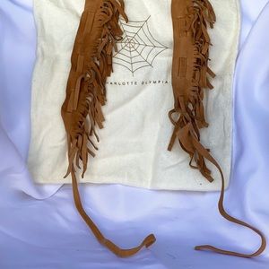 CharlotteOlympia, tan suede platform pumps with removable fringe strap. Never worn.