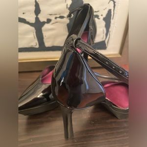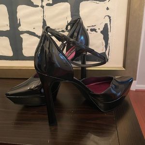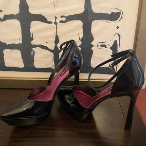 Never worn platform heels, small white scuff on back heel of one shoe. Barely noticeable, zoomed in for photo.
