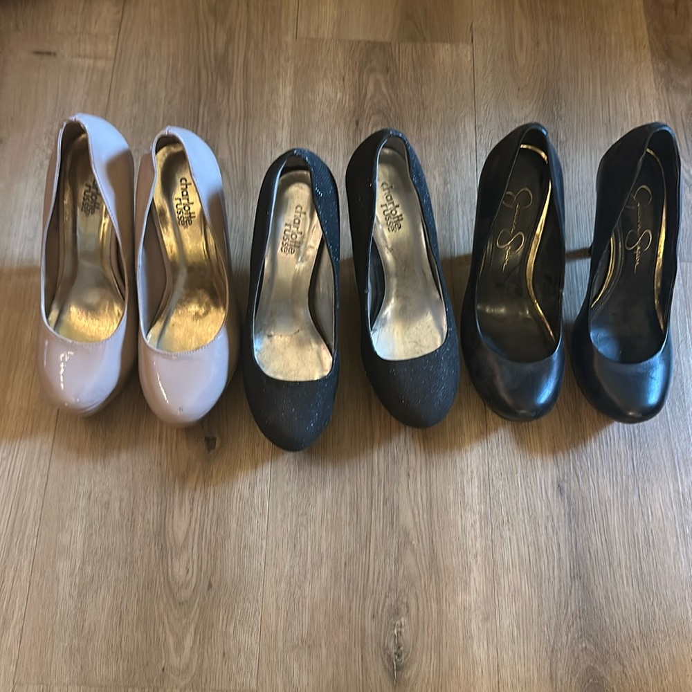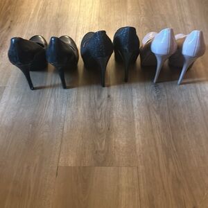 Platform heels 3 pair, all size 6. 1 shinny nude, 1 black sparkly, 1 flat black. Sold as a bundle