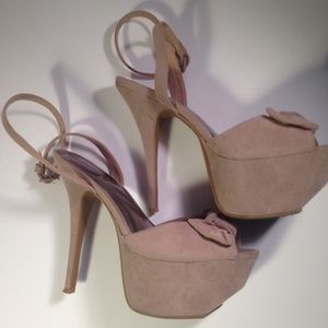 Platform, velvet, nude heels, with a sexy strap that loops behind and I front of your ankle. These are very comfortable because of the platform worn with business casual or sexy maxi. Worn twice so the bottom is slightly worn.