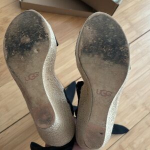 Wedge platform sandals. Black satin material tie around the ankles.