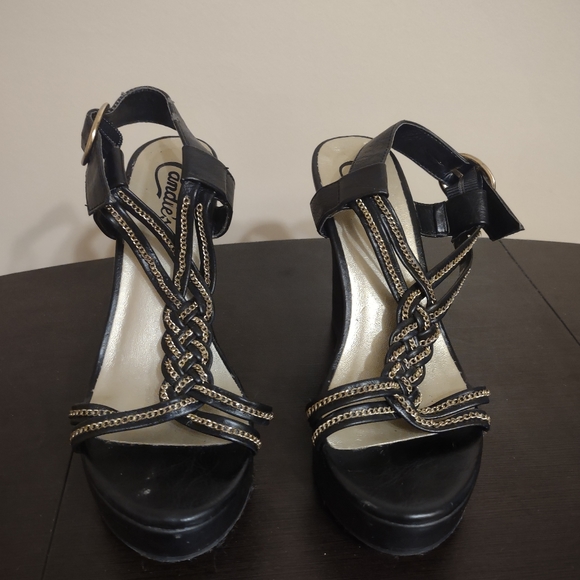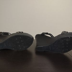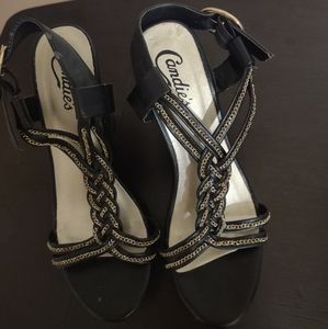 Candies brand Black with gold braiding on the straps. Excellent condition. 4in wedge heel.