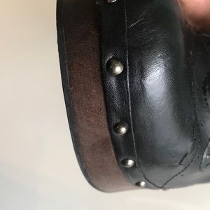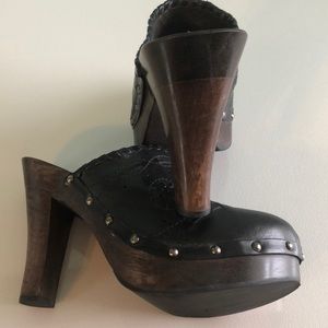 Looks new,Super comfortable,very light,leather upper ,wooden platform,true size