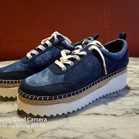 Blue platform sneaker with white sole. Worn once. Narrow fit.