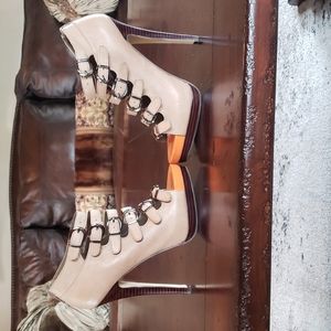 Platform tan booties with 6 buckle straps & a fun pop of orange under toes!