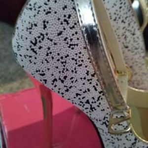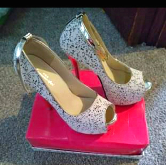 Size 6 white and gold and black speckled heels has ankle strap these were worn one time in excellent condition!!