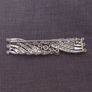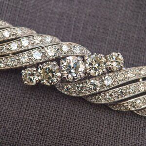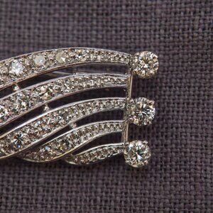 Platinum ribbon, lit end-to-end with diamonds. Five larger brilliants crest through the center; the field is pavé with crisp milligrain. It wears as a brooch or on a lapel for a clean, graphic line. Sparkle is outrageous in motion; I’ve included videos to show it.