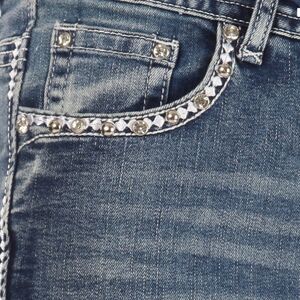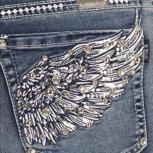 Stunning rhinestone, sequins angel wing embroidery on a boot-cut denim jean with extra detailing on yoke & pocket trims. The back pockets are sewn together, they give the illusion of a pocket.