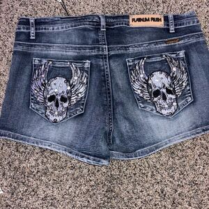 Shorts with a skull/wing stitching embellished in sequence/rhinestones