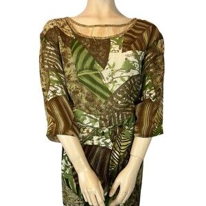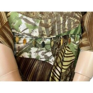 • Layered sheer boxy top in leaf print with leaf shaped plastic bead fringe bottom