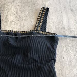 Black and gold square neck one-piece bathing suit. ribbed design with exposed elastic gold trim. flattering style and cut.