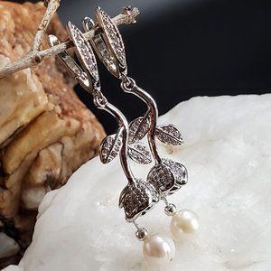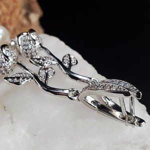 Platinum-plated Earrings White Topaz Natiral Pearl Floral Vintage Rose