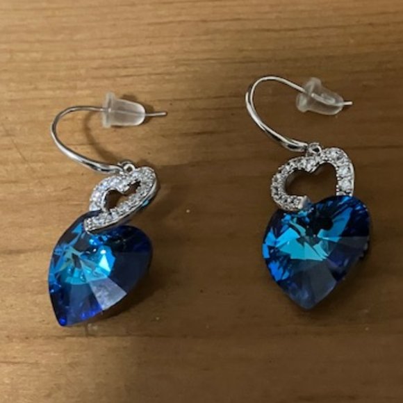 This is a new in box Women's Silver/Blue Swarovski Crystal Double Heart Earrings in One Size made by Plato H. It has a retail value of $40.