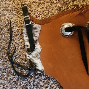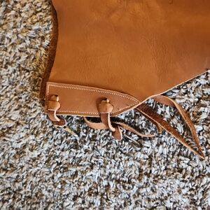 Used. Good condition. does show minimal marks on leather. missing on small leather strap. western. platter valley saddle. leather
