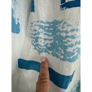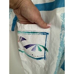 This Play Alegre blouse is a perfect addition to any coastal or beach themed wardrobe. With a collared neckline, long sleeves and button closure, it features a beautiful white color with hand-painted accents of coastal boats and fish.. It also has convenient pockets and is preshrunk, ensuring that it retains its shape after washing. This vintage blouse is perfect for women who love the beach and coastal lifestyle. Blouse is in good condition. Tag is faded but print is crisp and vivid. It is hard to read size but measurements roughly align to a size XL. Please refer to picture of measurements to ensure fit. There are a couple of what look like coffee stains on the blouse Ive tried to picture. Blouse has been washed sanitized steamed and bagged. Measurements in pictures. I appreciate your business and strive for a five star rating. Please feel free to message me with questions.