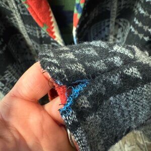 Cozy, bold, and ultra-warm reversible fleece jacket by Play Buffalo. One side features a vibrant Southwest/Aztec pattern in red, green, blue, and cream. The reverse side has a neutral black & grey geometric design. Soft fleece with a relaxed, easy-to-layer fit. Hooded, open-front style.