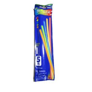 Bracelets are 8 inches. Five to a pack. Colors are red, yellow, blue, green, and orange.