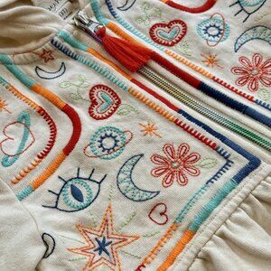 PLAY 🤸♀️ Peek Aren't You Curious Zen Embroidered Zip Hoodie, cropped with rainbow metal zipper, size 3T.