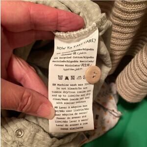 This jumpsuit is made of cotton corduroy and recycled cotton, in Light Green color. It has shoulder straps, a front opening with coconut buttons, an opening between the legs with nickel-free metal snaps (opening between the legs.