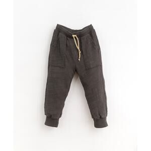 These jersey-stitch trousers are made of a mixture of organic cotton and recycled fibres, Charcoal color. This model has an elastic waist and adjustable drawstring, front pockets and wide elastic hems.