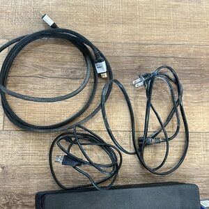 Has hdmi cord power cord and one controller charging cord.