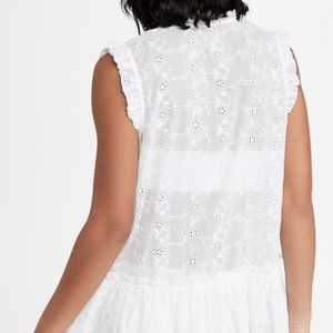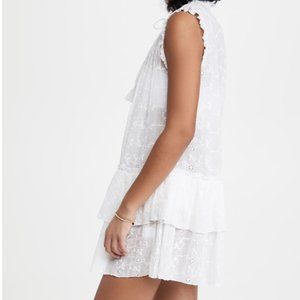 Subtle eyelet patterning, delicate ruffles, and a layered skirt bring a touch of understated romance to this bright-white Playa Lucila cover-up mini dress.