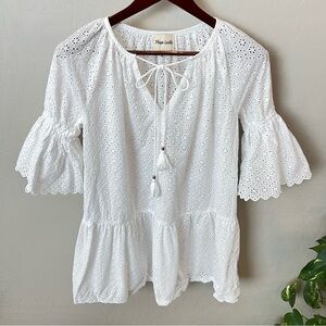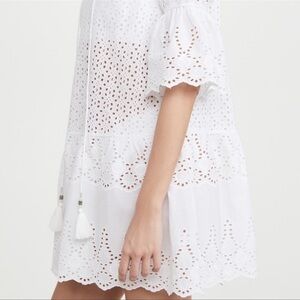 Playa Lucila white eyelet mini dress cover up, ellbow length puff sleeves, size M