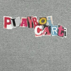 Stylish gray crew neck sweatshirt with a Playboi Carti graphic, perfect for adding a unique touch to your casual wardrobe. This eye-catching pullover features the artist's name in a cool, collage-style design, making it a standout piece. The sweatshirt offers a comfortable fit and classic style, suitable for everyday wear or for showing off your music taste at concerts, casual hangouts, or relaxed weekend outings.