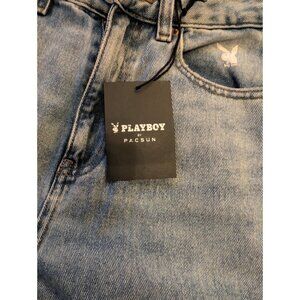The Playboy By PacSun Jeans in women's size 25 feature a solid blue denim fabric with a light wash, a regular fit, and a straight style. The jeans are accented with a zipper closure and the brand's logo, offering a trendy and distressed look. Perfect for those looking for a stylish and comfortable pair of jeans to add to their wardrobe, these PacSun jeans combine quality denim fabric with a fashionable design. #playboy #pacsun #90s #denim #retro