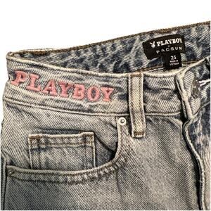 The Playboy By PacSun Light Wash Denim Jeans in size 23 feature a solid blue color with a pink bunny logo accent, adding a playful touch to the design. Made from 100% cotton denim with a relaxed fit, these mid-rise jeans have a zip and button closure, along with pockets for added functionality. The distressed detailing gives them a trendy edge, making them a stylish choice for women looking to make a statement with their fashion.
