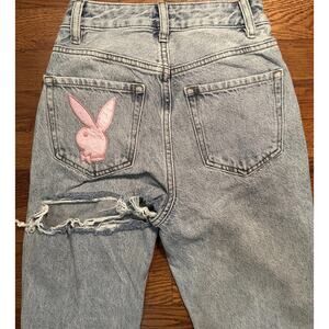 Playboy By PacSun Light Wash Denim Jeans Pink Bunny Logo Distressed Size 23