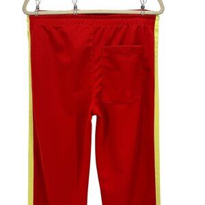 Playboy By Pacsun Mens Medium Bunny Red Striped Track Pants - Men's Size Medium - Pull-on style straight leg track pants - shade of red with white & yellow vertical stripes down the pant legs. Playboy Bunny logo on the front. Elastic & drawstring tie waist. 2 front pockets. Material has a stretch. 100% Polyester. Playboy X PacSun