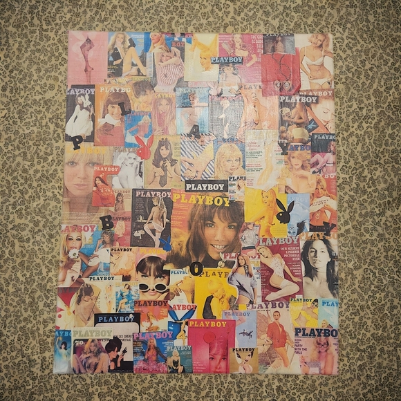 Vibrant Playboy collage art print featuring iconic magazine covers. Perfect for adding a pop of color to any space.