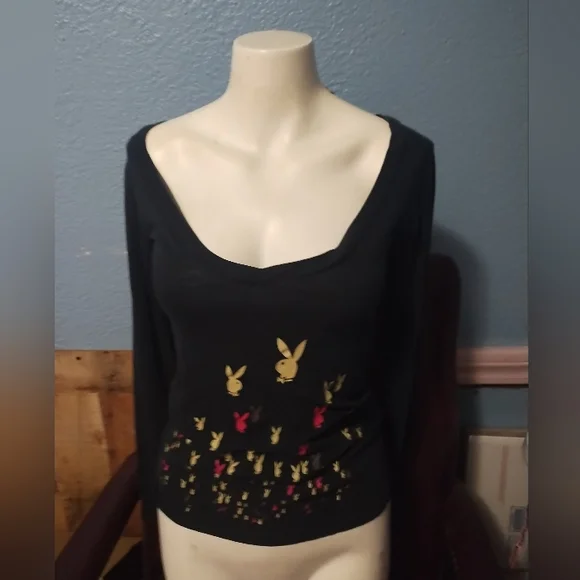 Black Playboy long sleeve top with lil playboy bunnies along the front in red, goldish, and gray. It's size small with a scooped neckline and no signs of wear. Bundle for personal discount. Free 🎁 with all purchases...