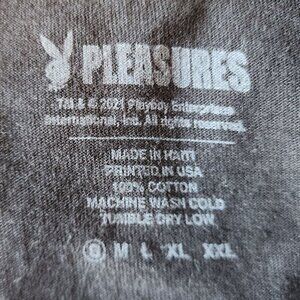 Short sleeve black shirt with a neon pink & purple Playboy Bunny logo graphics on the front. Pleasures spelled out. 100% Cotton. Made in Haiti & printed in the USA.