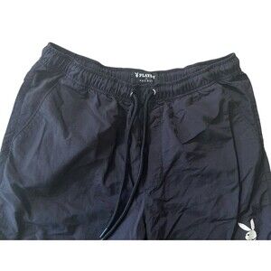 Playboy by PacSun mens black nylon shorts, size Medium. Features elastic waist with adjustable drawstring, side pockets, and embroidered Playboy bunny logo on the hem. Lightweight nylon shell with polyester lining for comfort.