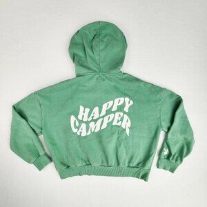 Playboy by PacSun Women's 1/2 Zip Hoodie Size Sm Green with kangaroo pocket on the front and Happy Camper on the back - See condition notes!