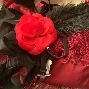 Includes bustier with attached garter, fringe skirt, cuffs and headpiece