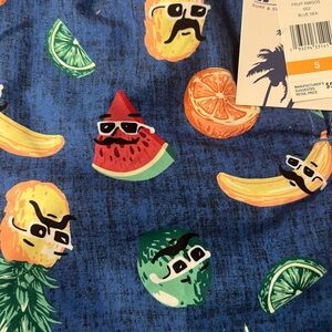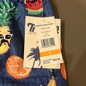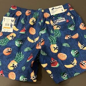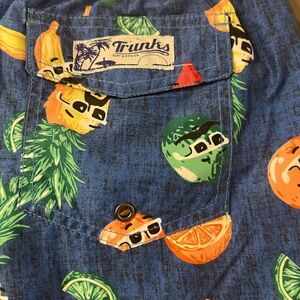 Make a splash with these vibrant blue swim trunks, adorned with a whimsical citrus fruit pattern. The elastic waistband and white drawstring ensure a comfortable fit, perfect for beach outings or poolside fun. The lively design adds a touch of tropical flair to your swimwear collection.
