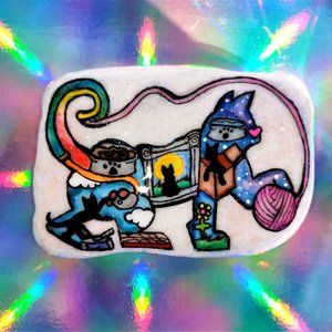 Kitty is having a ball with the yarn as her deepest thoughts reflect inside of her silhouette on this hand painted santorini stone. She loves to look out of the window and play with her toy mouse as she makes a cardboard box a temporary house! She loves eating her food and drinking her water throughout all hours from dawn to dusk. She also adores her scratching post filled with catnip. Makes the purrfect gift for a cat lover. All handpainted in multiple layers including with a toothpick for the fine details on natural santorini stone imported from Greece with a holographic sheen that showcases the artwork. Sealed in a clear UV-resistant non-yellowing resin to preserve the colors and integrity of the artwork for many years. Size: 2.5” X 3.75” Weight: 10.2 oz