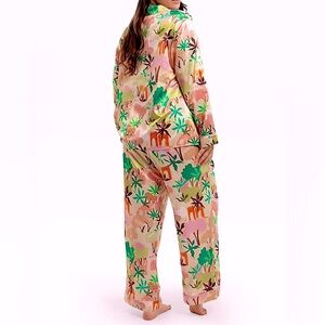 Experience luxurious comfort with this abstract pajama set. Featuring a vibrant mix of pink, green, and orange hues, this set is perfect for a cozy night's sleep.
