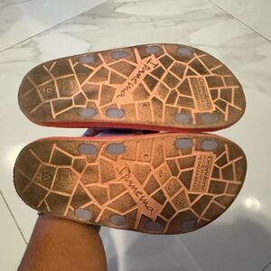These fun and colorful kids' sandals feature a delightful purple and pink design, perfect for playful days. Easy to slip on and comfortable for all-day wear.
