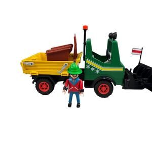 This is a vintage Playmobil 3695 Snowplow Truck set. Features a green cab with snowflake decals, yellow dump bed, front snowplow blade, and driver figure.