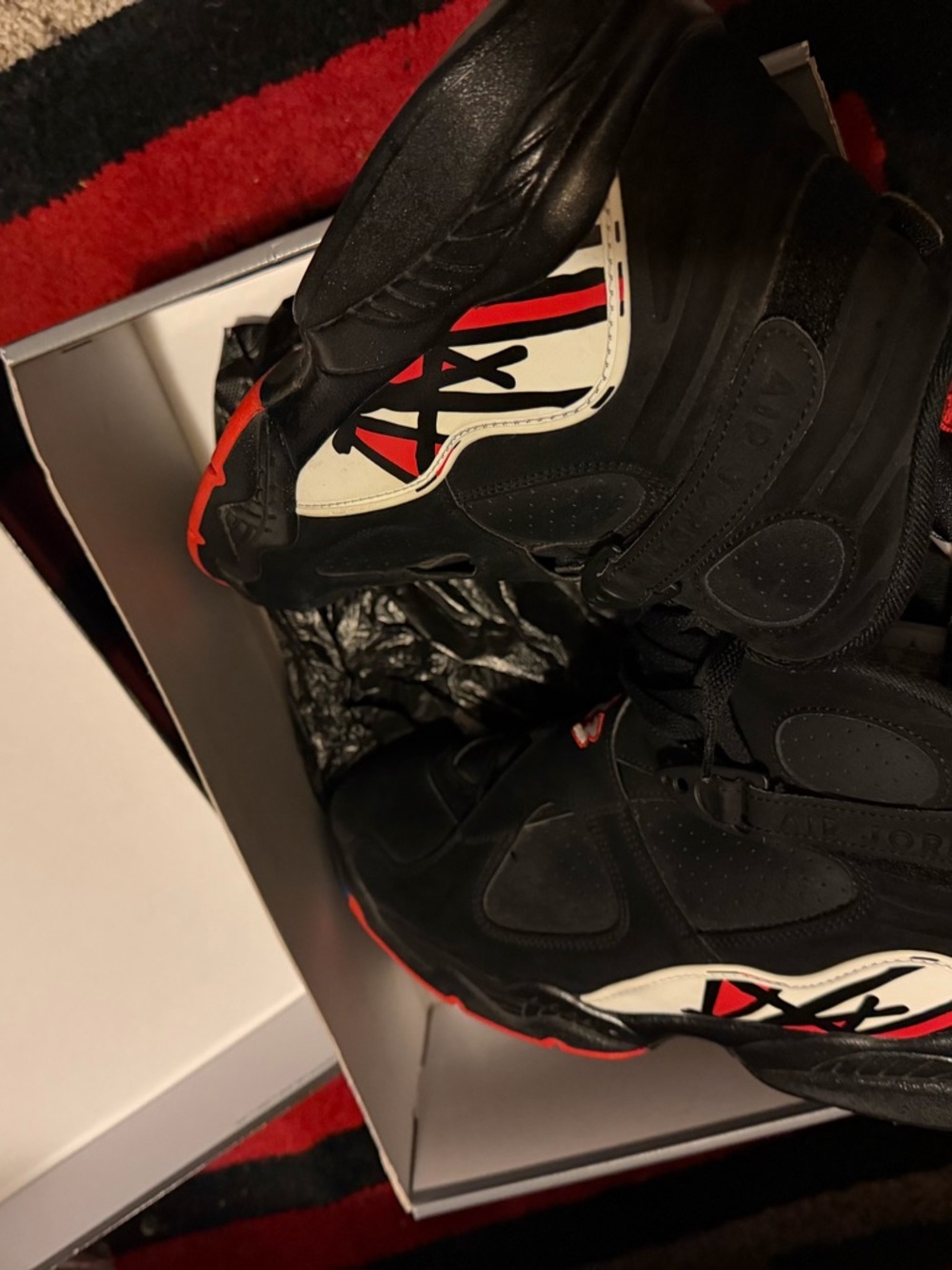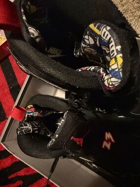 Classic Jordan styling for kids. Black upper with red and white accents. Padded support and secure lacing. Durable outsole for play. Sporty look kids will love.
