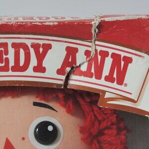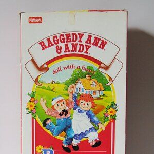 The Playskool 1987-1989 The Original Raggedy Ann Doll is a vintage collector's item measuring 16 inches tall. This doll features a soft cloth body with a red curly hair, black eyes, and a light complexion. The Raggedy Ann doll is part of the beloved franchise created by children's author Margaret Wise Brown and is an original licensed reproduction from Playskool.